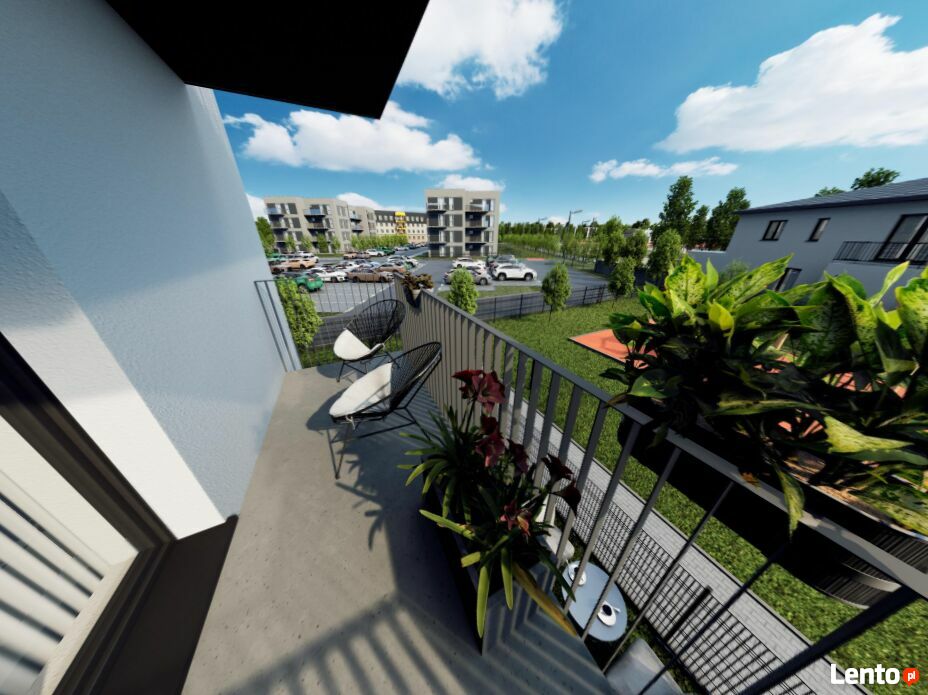Duży balkon z widokiem na teren zielony i plac zabaw